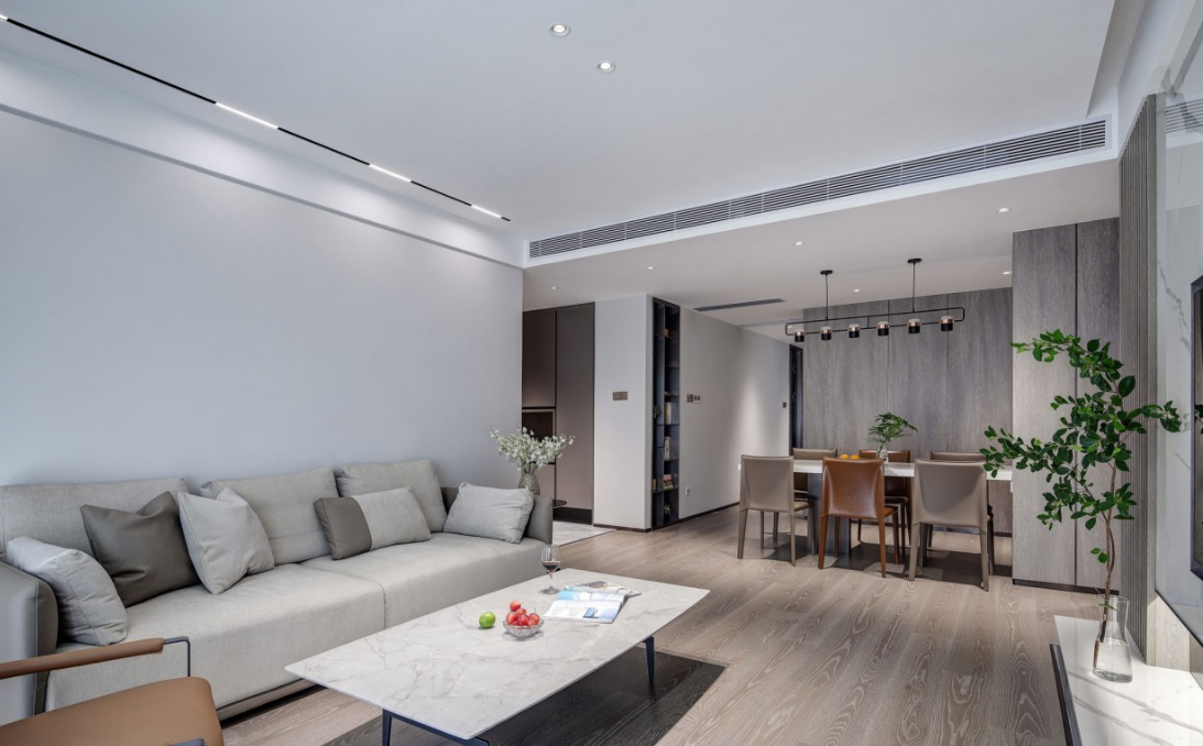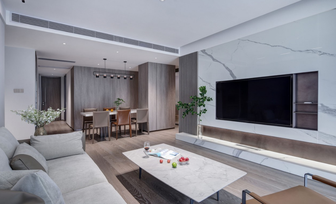 采用明亮而不眩目的無主燈設(shè)計,筒燈與磁吸燈簡約靈活的泛光照明,電視背景墻下隱藏?zé)魩У男Ч麪I造優(yōu)化了空間形體以及局部的明暗關(guān)系。