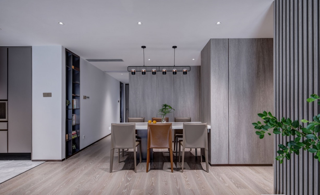 餐廳承重柱是不少人會選擇回避的設(shè)計難點,設(shè)計師獨出心裁,將大理石桌面嵌入其內(nèi),遠(yuǎn)遠(yuǎn)望去,白色餐桌宛若浮空、靈動而輕盈,同時完美消解了承重柱礙眼的視覺效果