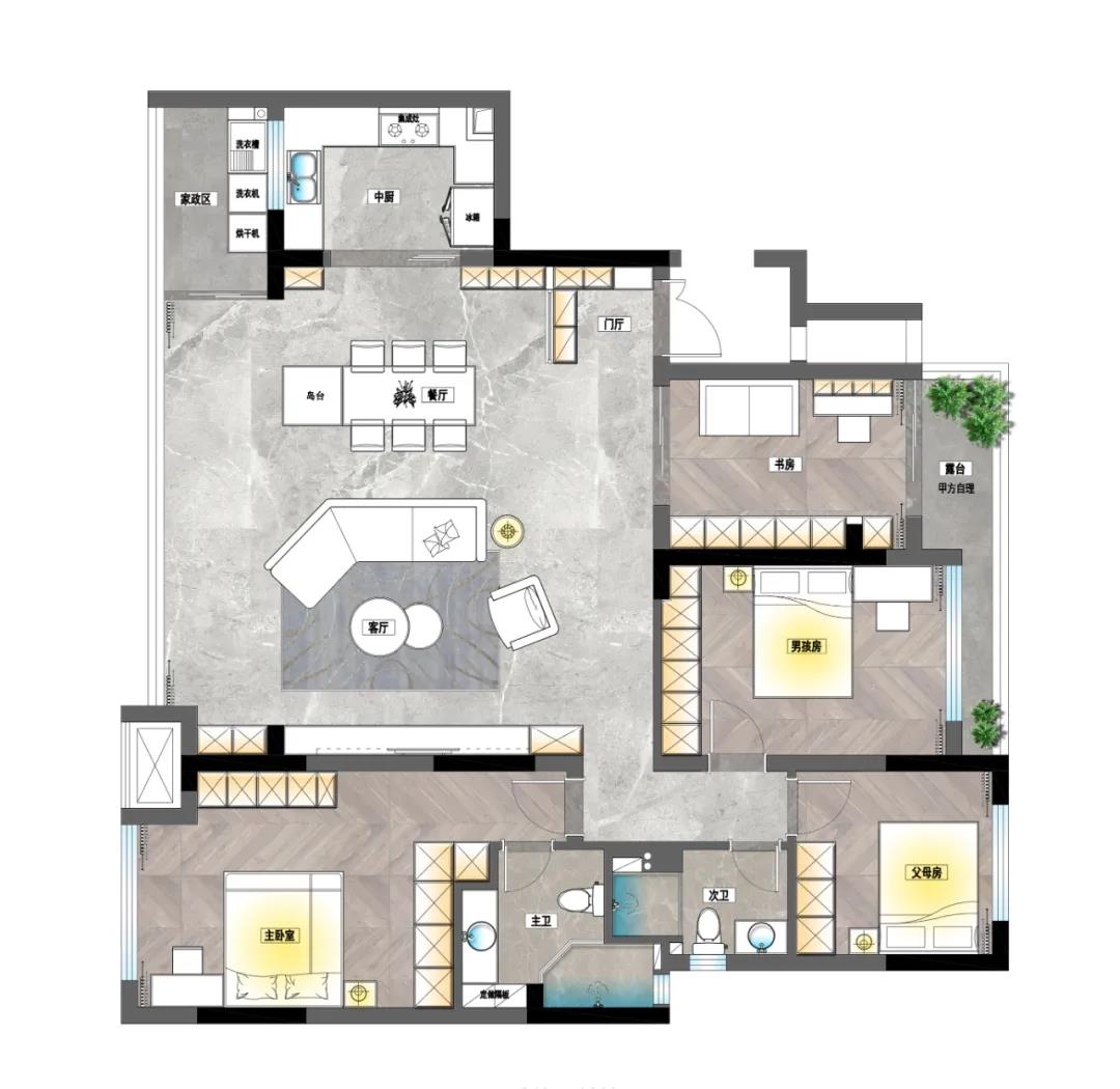 本案例中,常住人口是祖孫三輩5人,空間規(guī)劃上,客戶有比較大的收納需求。在充分了解客戶喜愛的設(shè)計(jì)風(fēng)格與需求后,設(shè)計(jì)師結(jié)合實(shí)際戶型,將一個(gè)輕奢又溫柔的家居空間呈現(xiàn)在我們面前。