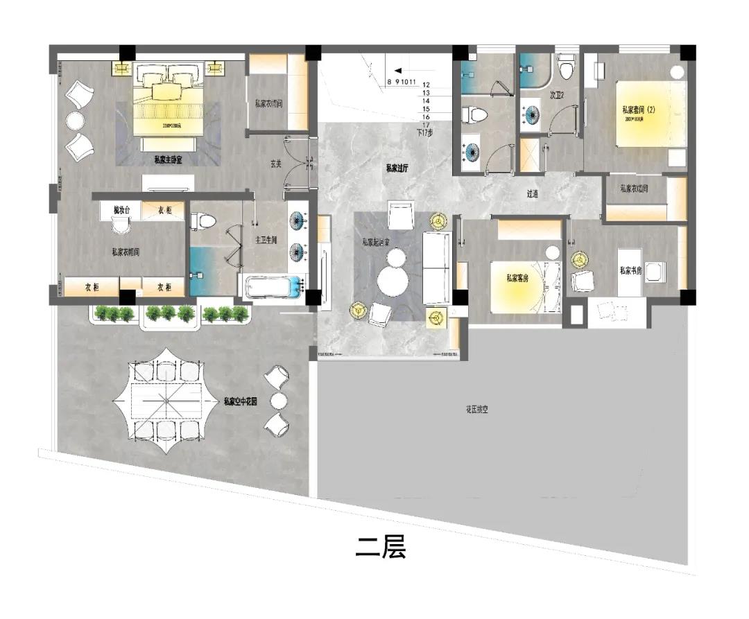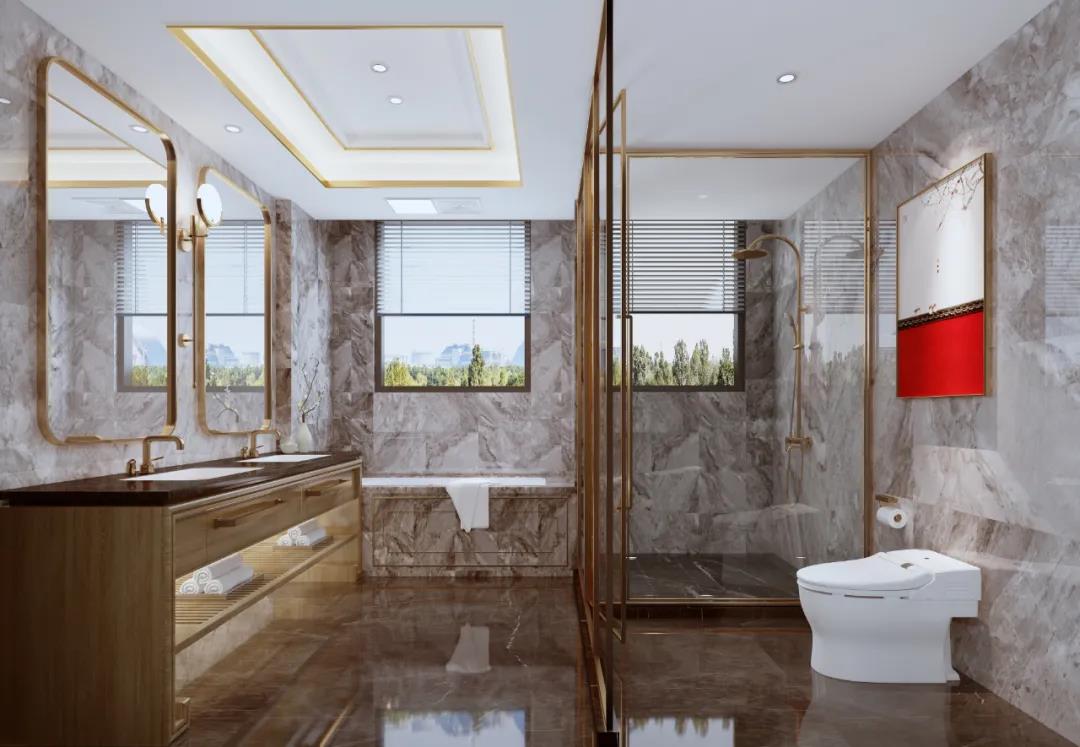 主衛(wèi)采用雙臺(tái)盆的設(shè)計(jì),方便主人進(jìn)行梳洗打扮。浴缸、淋浴間、馬桶均單獨(dú)隔開(kāi),盡可能減少衛(wèi)生間的積水情況,保持衛(wèi)生間的清潔,方便打掃,也是為了健康。除此之外,衛(wèi)生間的裝潢均采用黃銅金屬、大理石花紋,打造出奢華之感。