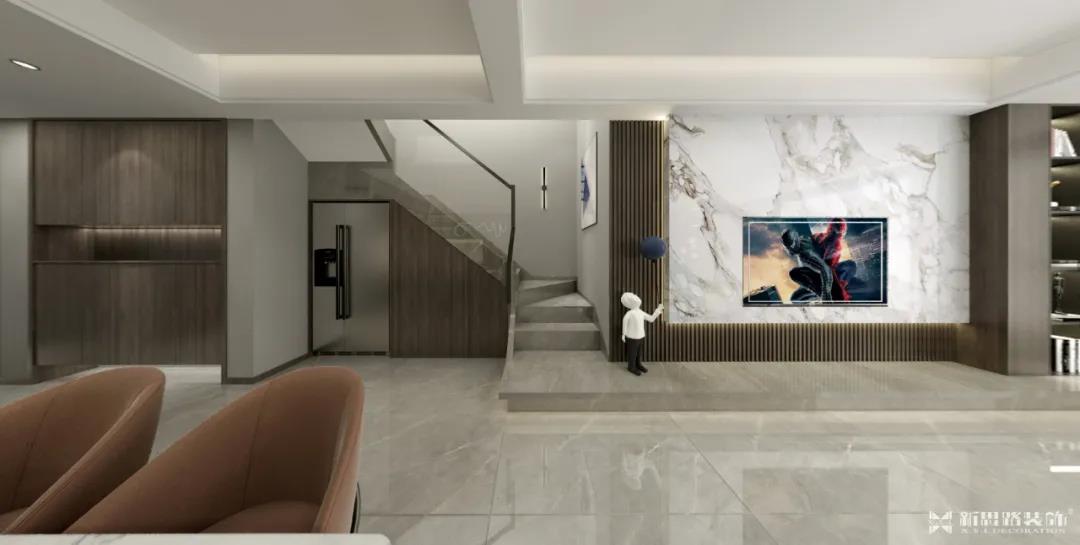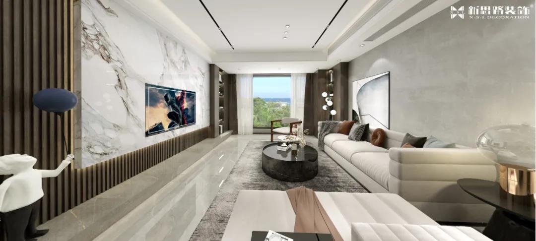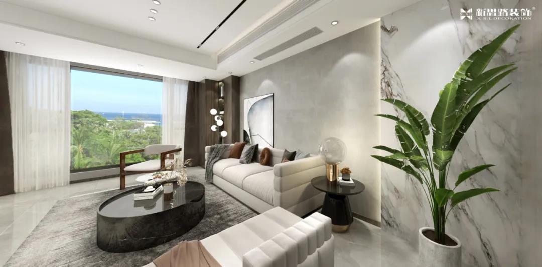 在會客廳的設計上,采用當下現(xiàn)代風格設計中流行的無主燈方案,配合超大的觀景落地窗,讓室內(nèi)的光線明亮柔和而不刺眼。色彩搭配上,選擇深淺結(jié)合的方式,深的是木紋、淺的是大理石和皮質(zhì)沙發(fā),組合出略帶奢華、但又低調(diào)內(nèi)斂的空間氛圍。
