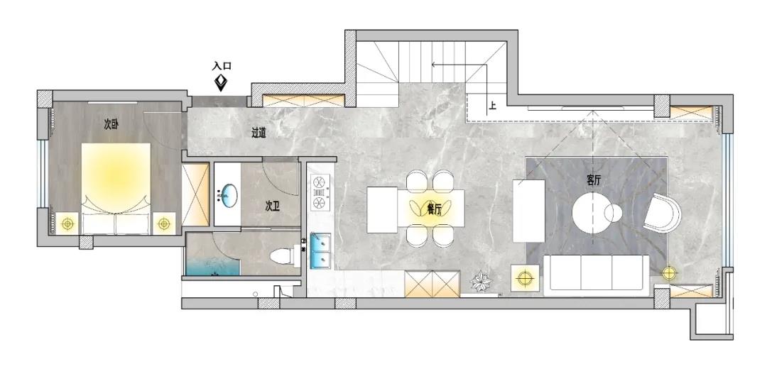 The first floor is the living area, and the oversized meeting room gives people a sense of spacious atmosphere. Because consider permanent living population is not much, and it is two old people, food is relatively delicate, do not need particularly much cooking function relatively for, also won't produce particularly much lampblack, use the design of open mode kitchen so, dining-room and kitchen are connected as an organic whole, also be to reduce a space to break up, convenient old people walk, have dinner.