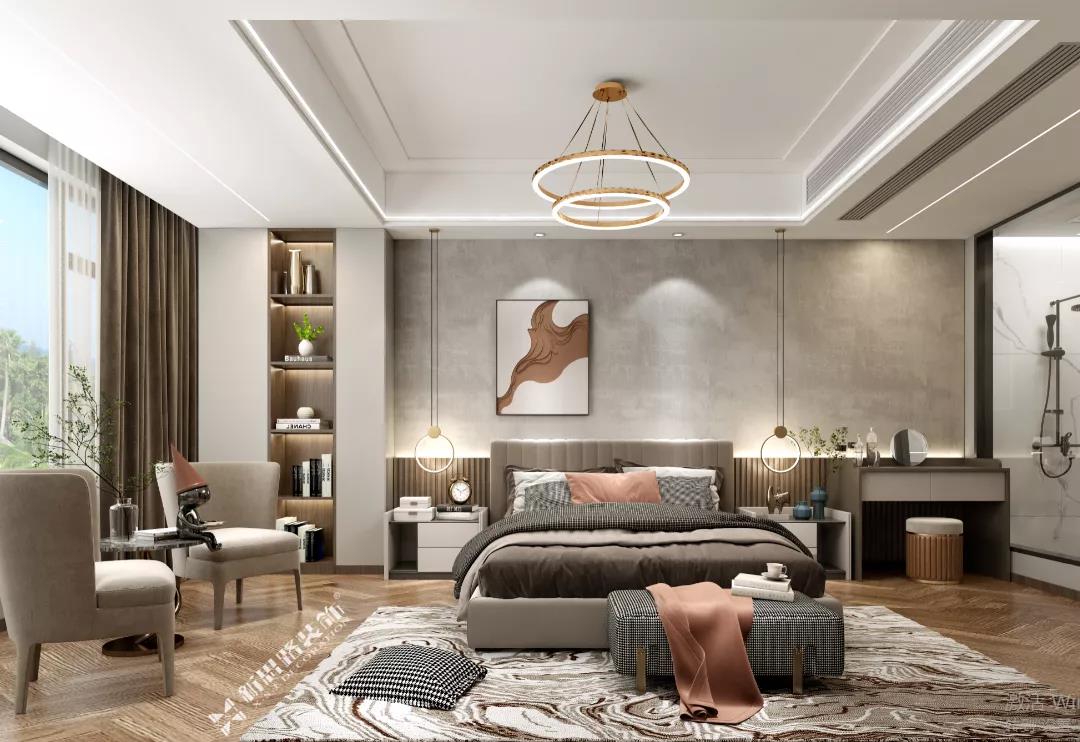 主臥我們沿用會客廳的設計思路和配色,仍舊是以暖棕色、深南瓜色和米白、暖灰等顏色搭配組合,并選用比較具有藝術(shù)感造型的吊燈,讓整個空間在保持屬于家的那份溫馨前提下又有更多的美感。茶幾是為客戶夫妻專門準備的,閑暇時在此小坐品茗,聊聊生活,談談往事,不失為好去處。