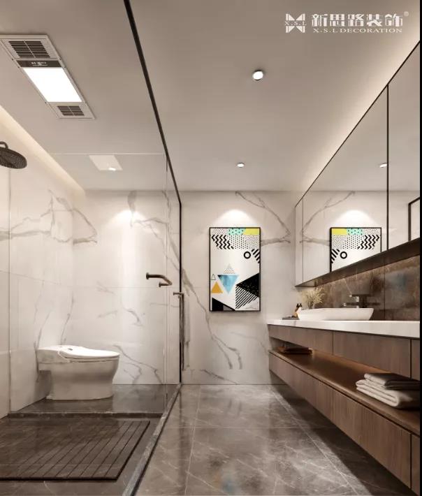 主衛(wèi)的設計上,三分隔的設計與懸空的柜體能最大限度減少積水的產(chǎn)生,易于打理和保證衛(wèi)生間的清潔,大面積的梳妝鏡大方好看。淋浴間特制防滑設計,增大摩擦力,預防老人洗澡時跌倒。