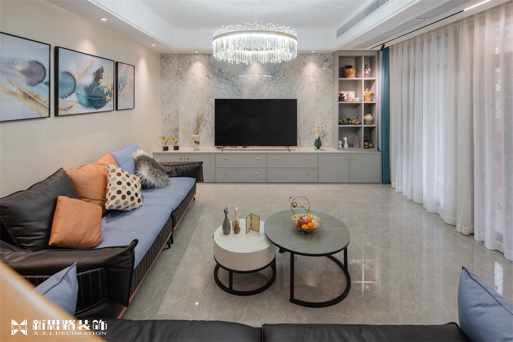 餐廳延續(xù)了整體空間的主色調(diào)和線條美感,大理石餐桌蓄意帶來(lái)一種自然的藝術(shù)氛圍,在原有的沉穩(wěn)柔和中注入新的活力,素色的皮革餐椅打造出舒適的觸感。讓人全情地投入生活,熱愛(ài)生活中一食一飲的歡愉??蛷d與餐廳開(kāi)放式相連,整體色調(diào)素雅大氣,將抽象的自然意象,化為簡(jiǎn)約的視覺(jué)符號(hào);背景墻面的藝術(shù)裝置,擁有琥珀色的溫暖氣息,帶來(lái)多維度的層次感;樸素、自然、溫暖,設(shè)計(jì)師以現(xiàn)代藝術(shù)演變空間圖案,讓人不經(jīng)意間,總能感受到時(shí)間的沉淀。
