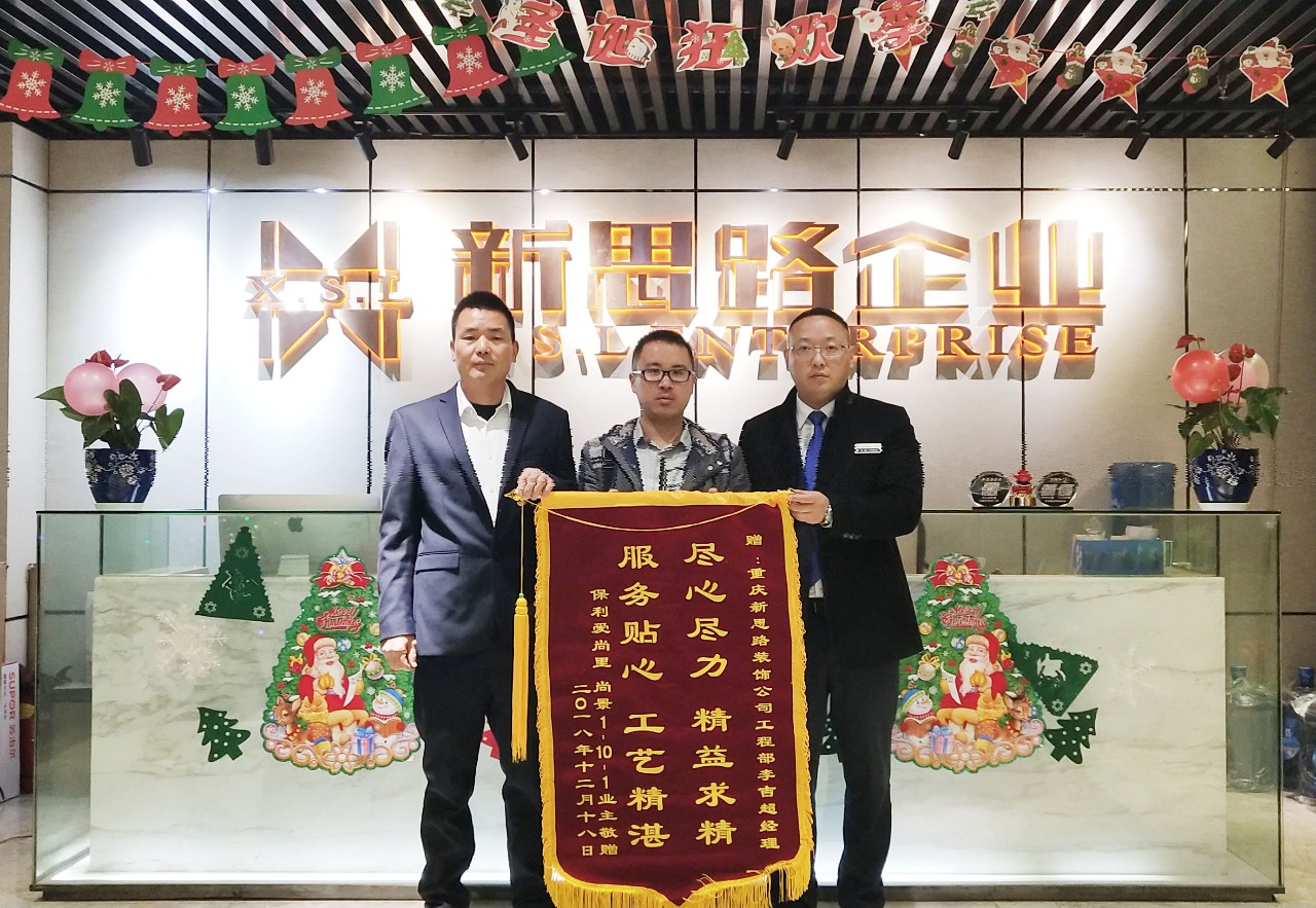 2018年12月24日下午,來自保利愛尚里·尚景的業(yè)主鐘老師專程來到南坪總部,將一面印有“盡心盡力,精益求精,服務(wù)貼心,工藝精湛”的錦旗交給我們的項(xiàng)目經(jīng)理李經(jīng)理手中,以感謝新思路裝飾高品質(zhì)工藝和優(yōu)質(zhì)貼心的家裝服務(wù)。