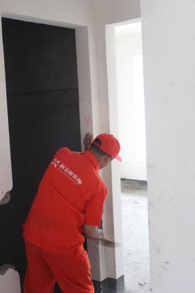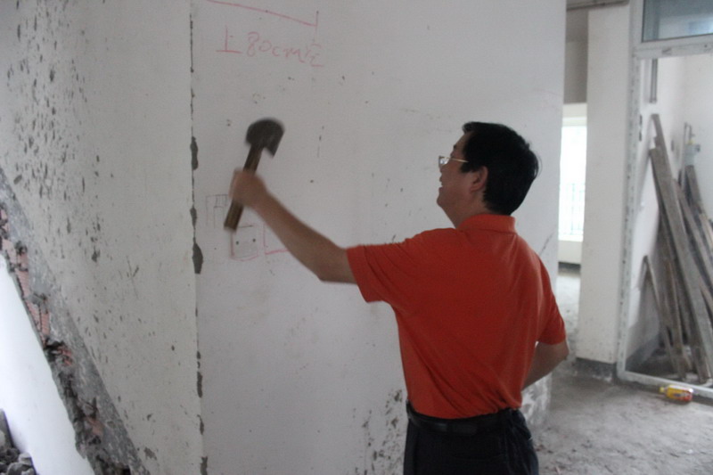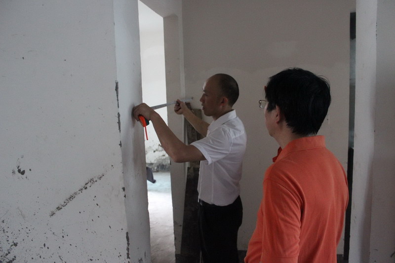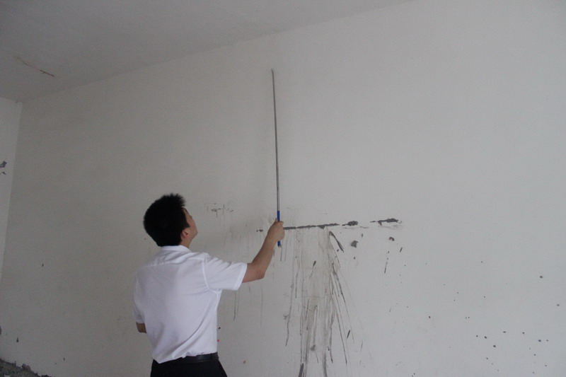 工程質檢正在仔細檢查墻體有無空鼓情況。