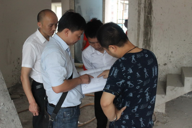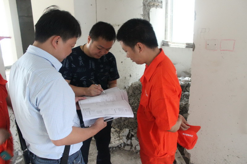 工長和工人師傅對照圖紙,認真討論電線的排版、走位;插座組數(shù);強弱電箱安裝位置等細節(jié)。