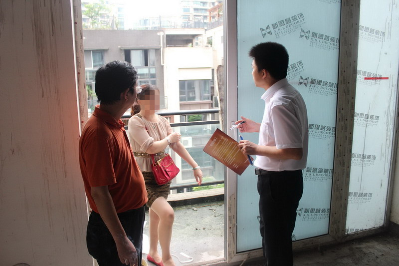 質檢正在向潘老師夫婦介紹公司施工管理和服務的標準。新思路裝飾一直堅持“客戶滿意是唯一的工作標準”,努力踐行“裝修做客戶口碑”的理念,致力為每一位客戶提供高品質的工程質量和裝修服務。