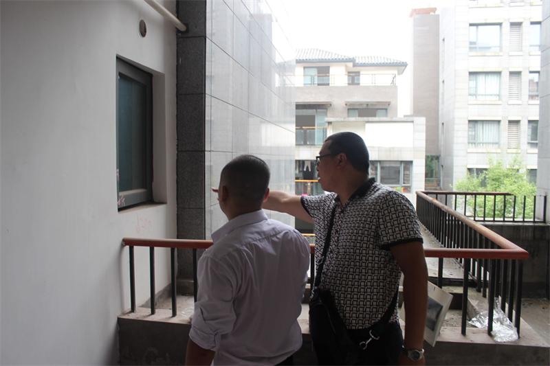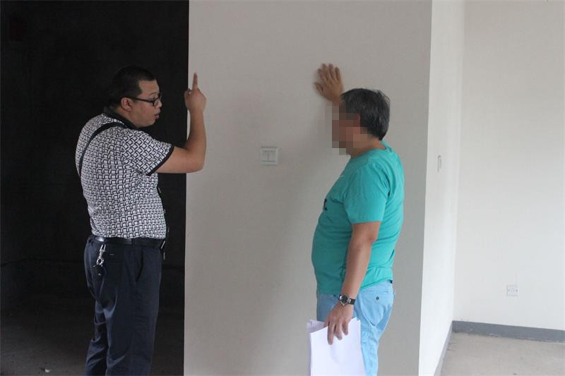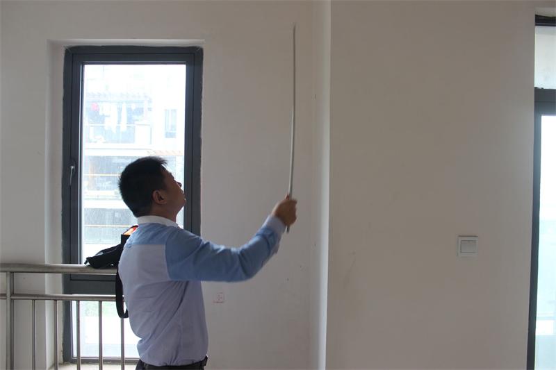 工程質(zhì)檢正在認真檢查墻體是否存在空鼓情況。出現(xiàn)空鼓問題的,質(zhì)檢會立即向物管反應(yīng),督促物管及時解決問題。