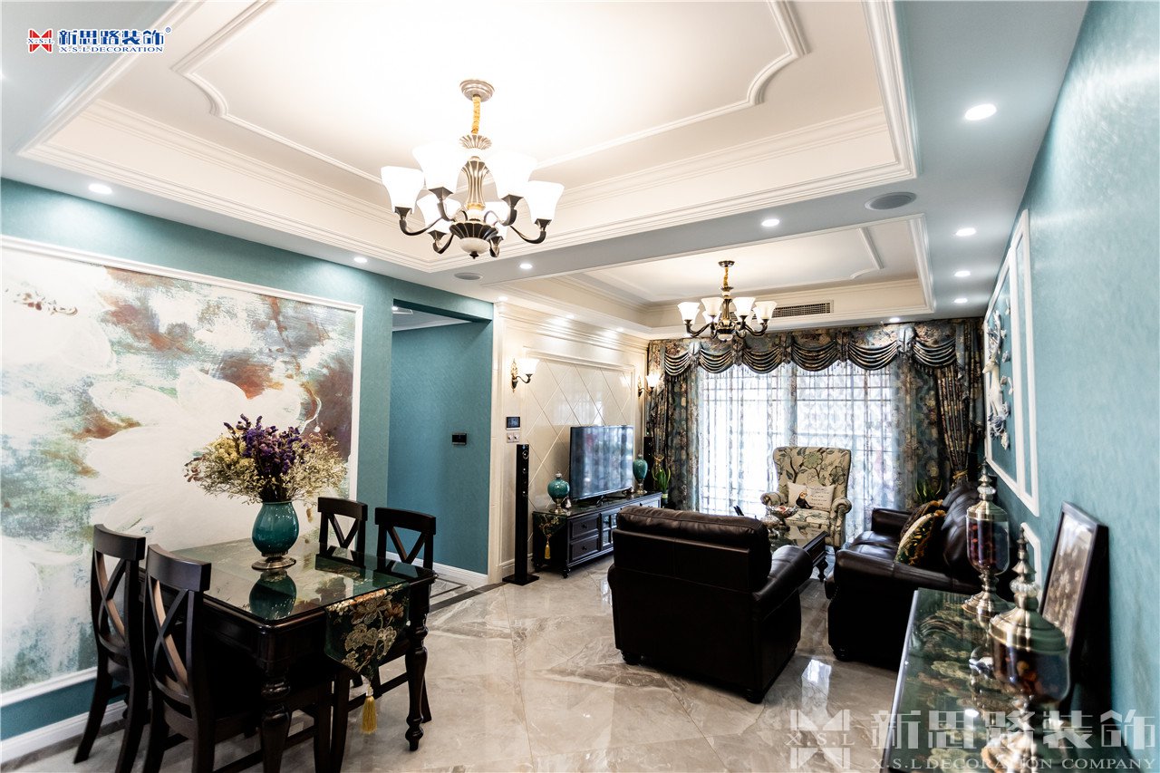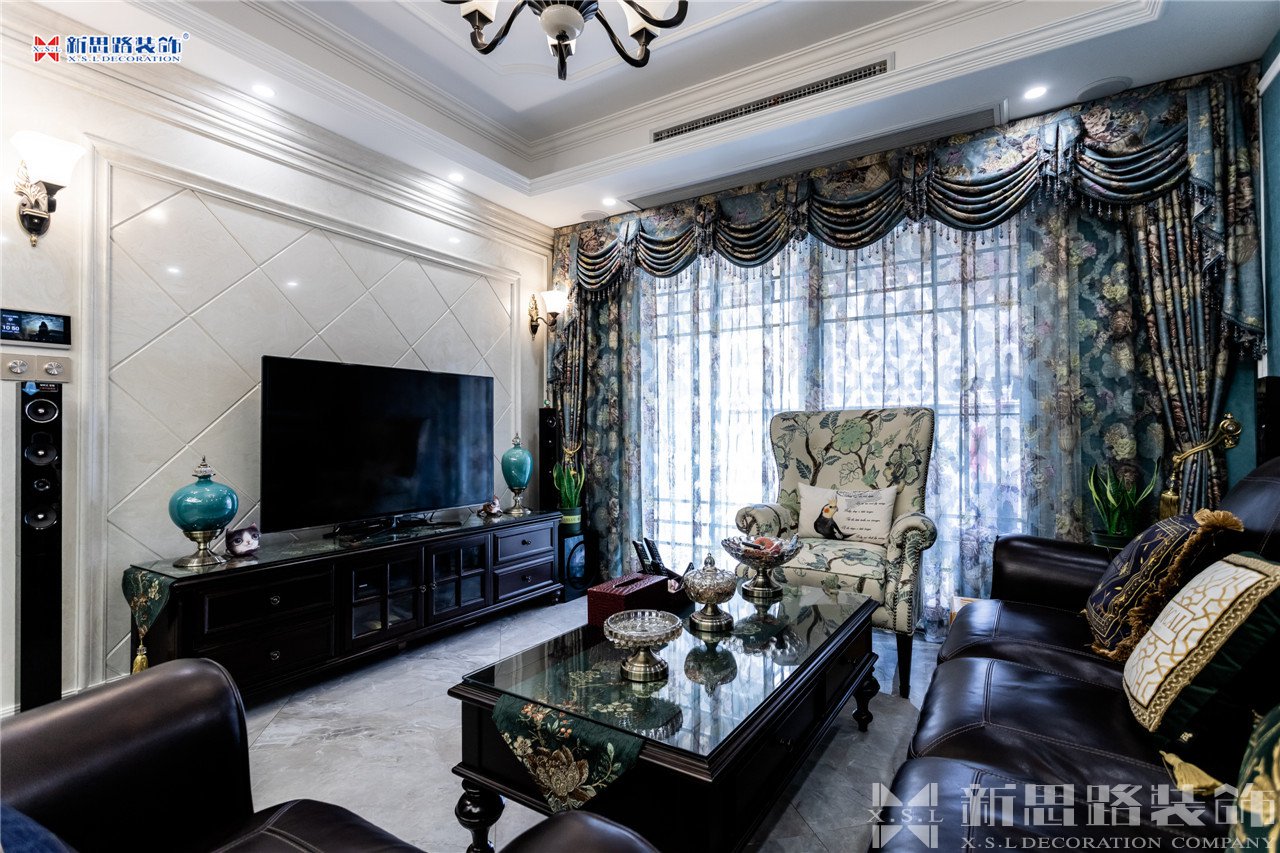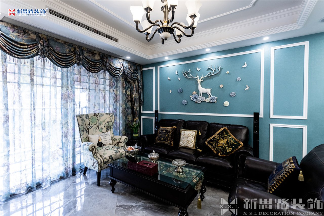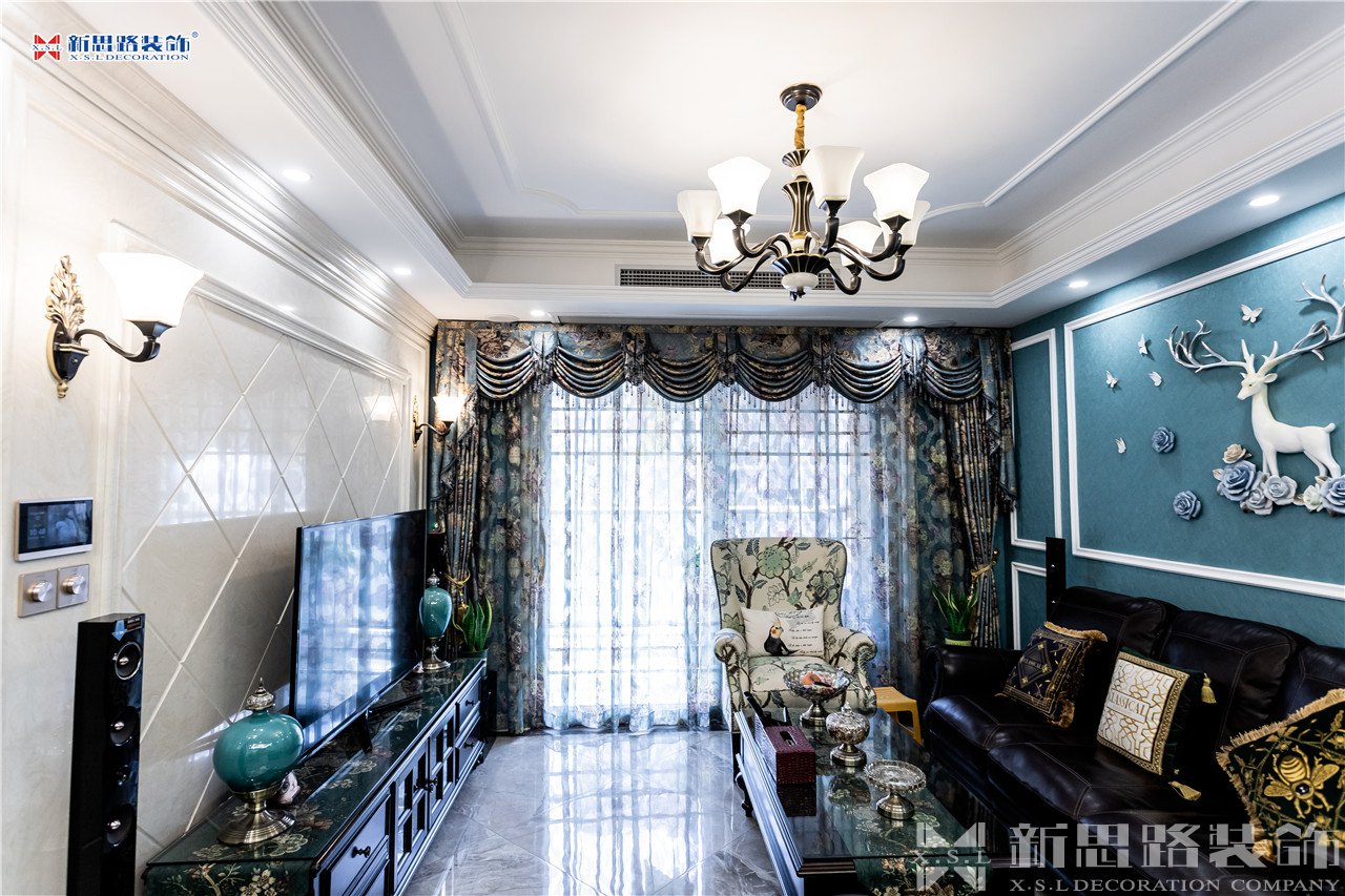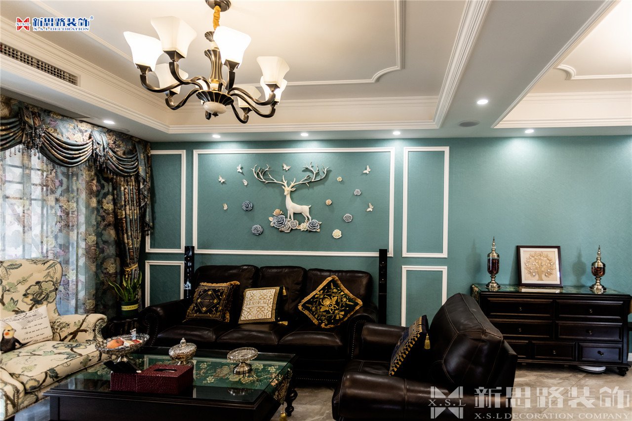 沙發(fā)背景墻使用石膏線材勾畫幾何圖形,古典優(yōu)雅;陶瓷的小鹿漫步花間,野趣橫生。復(fù)古花色的窗簾與真皮質(zhì)地的沙發(fā)以及實(shí)木電視柜搭配起來(lái)正合適,線條分割成菱形網(wǎng)格狀的乳白色電視背景墻大方低調(diào),黃銅色美式吊燈干凈明亮。深墨綠色的織錦桌旗無(wú)形中又添了點(diǎn)奢華意味,油青色的仿古裝飾擺件也是非常經(jīng)典的美式元素體現(xiàn)。
