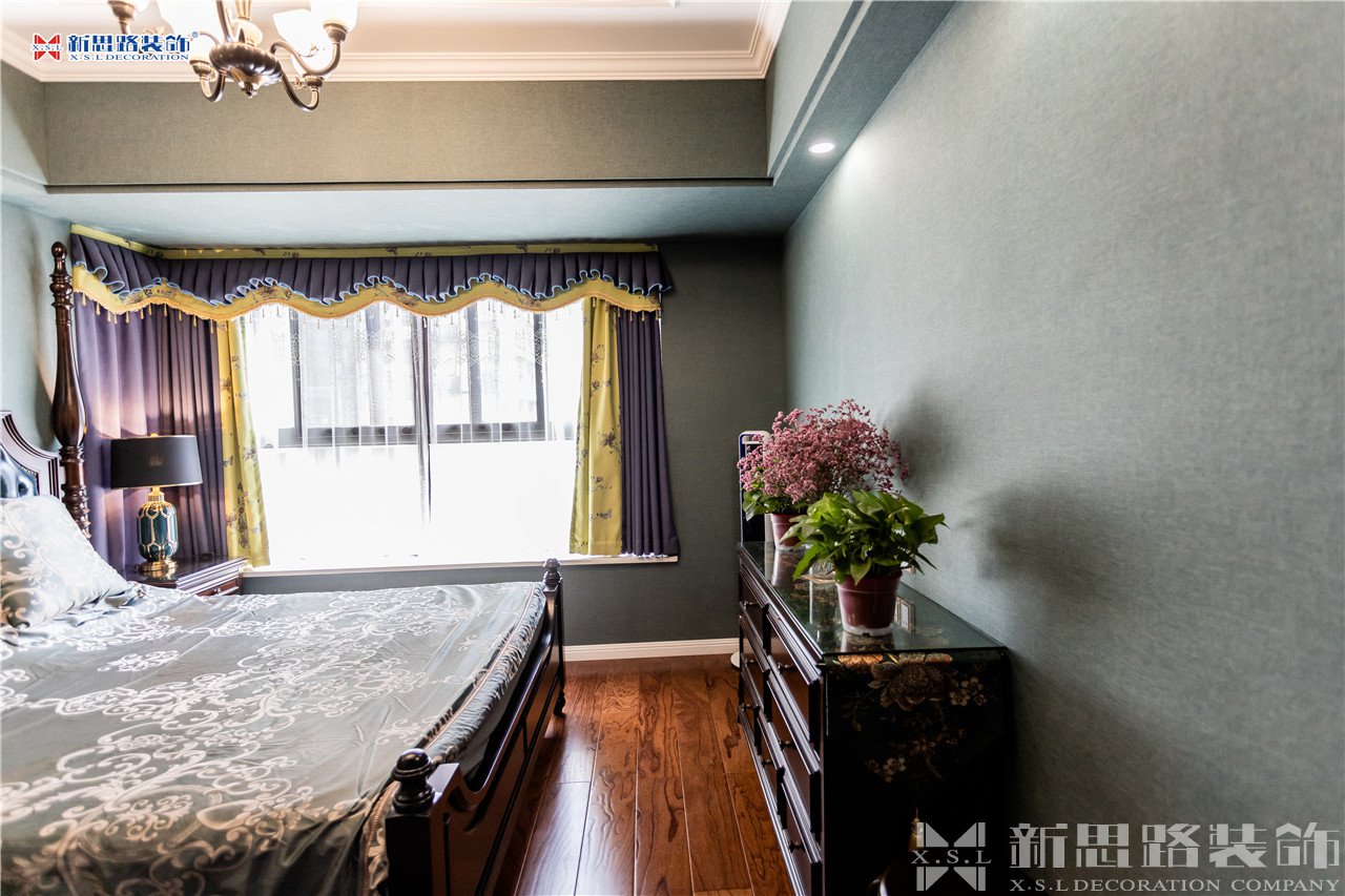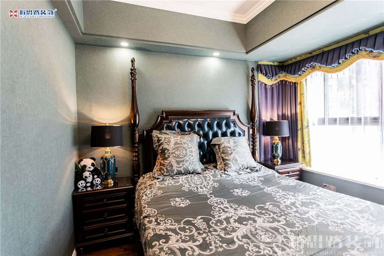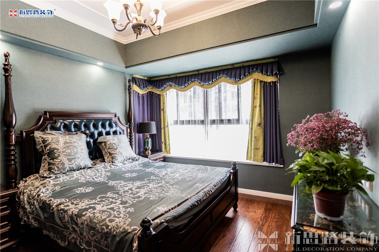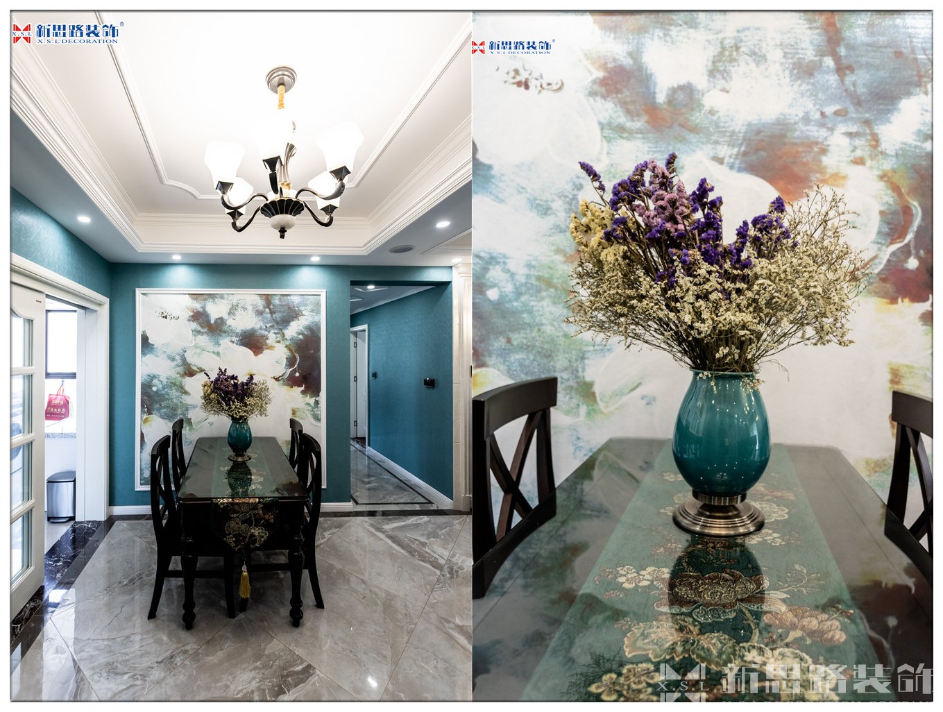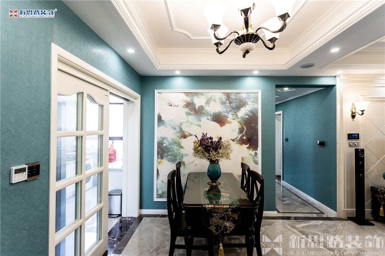 沙發(fā)背景墻使用石膏線材勾畫幾何圖形,古典優(yōu)雅;陶瓷的小鹿漫步花間,野趣橫生。復(fù)古花色的窗簾與真皮質(zhì)地的沙發(fā)以及實(shí)木電視柜搭配起來(lái)正合適,線條分割成菱形網(wǎng)格狀的乳白色電視背景墻大方低調(diào),黃銅色美式吊燈干凈明亮。深墨綠色的織錦桌旗無(wú)形中又添了點(diǎn)奢華意味,油青色的仿古裝飾擺件也是非常經(jīng)典的美式元素體現(xiàn)。