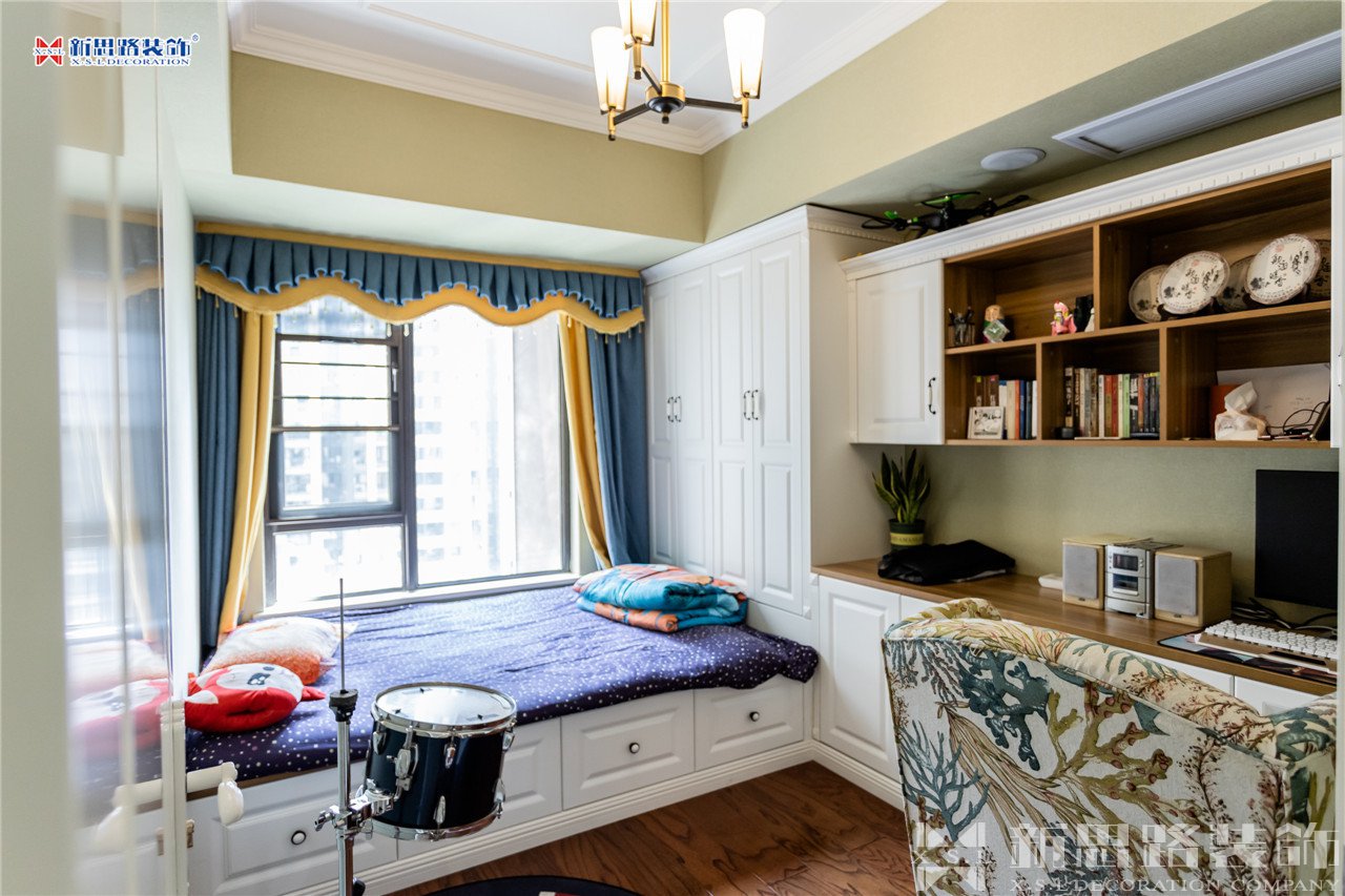 次臥是帥氣兒子的房間。學(xué)生難免書籍和雜物較多,床鋪采用榻榻米的設(shè)計(jì)更便于物品收納,長(zhǎng)條形的書桌在擺放電腦后仍留有許多空間。書架近在咫尺,手邊是舊式磁帶播放器,心愛的架子鼓就在身后,音樂(lè)夢(mèng)想和學(xué)習(xí)并不沖突,小小的空間滿載的是青春的律動(dòng)。