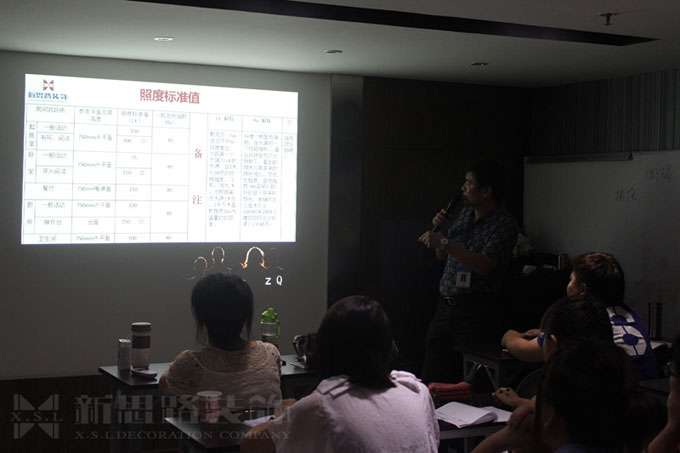 張總通過現(xiàn)場投影儀,對主要設(shè)計目標(biāo)、材料運(yùn)用、照度標(biāo)準(zhǔn)值、家的空間、人體工程學(xué)、風(fēng)水基本要素、功能空間設(shè)計等進(jìn)行了詳細(xì)的闡述和講解。與會資深設(shè)計師還分享了各自的設(shè)計心得體會,講解了不同裝修風(fēng)格中應(yīng)該注重的細(xì)節(jié),不可缺少的元素,設(shè)計與工藝的有效融合……張總和設(shè)計師們精彩、風(fēng)趣的演講,讓培訓(xùn)現(xiàn)場不時傳出陣陣掌聲與歡笑。