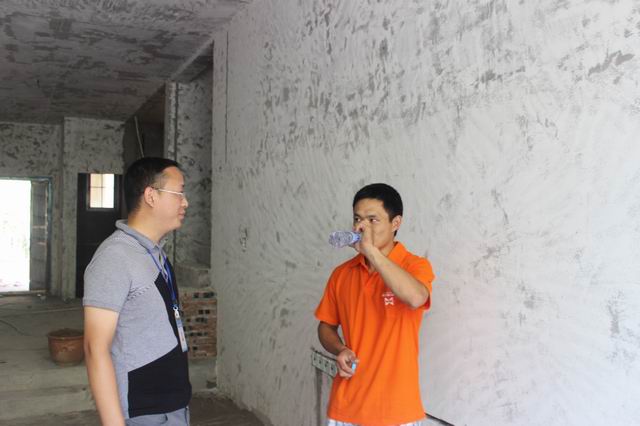 工人師傅在向張總及慰問小組一行匯報自己貼磚工藝及工作情況