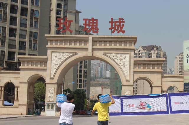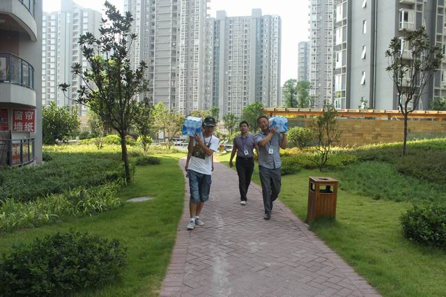 張總及慰問小組一行扛起水向東方雅郡小區(qū)施工工地進發(fā)送水