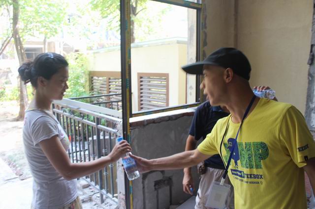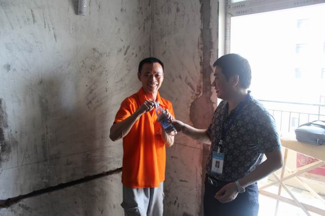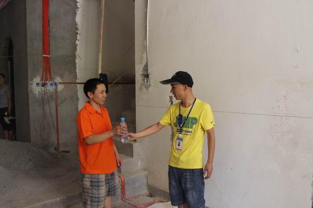 工程質(zhì)檢親自將礦泉水送到工人師傅手中