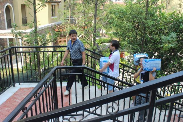 在金源御府、麓山別苑、雅居樂、東方雅郡、龍湖U城、廊橋水鄉(xiāng)、融僑城等工地,張總、工程部文經(jīng)理等均親身參與到為工人派發(fā)防暑降溫物品的隊伍中。烈日下,他們的衣衫被汗水濕透,但他們依舊精神飽滿。在每一處工地,張總都會親自給工人師傅遞上一瓶水,并向他們表達最誠摯的慰問和感謝。他表示:“現(xiàn)在氣溫高,裝修任務(wù)重,大家辛苦啦!謝謝你們的辛勤工作,要注意安全,注意身體。”臨走時,他還反復(fù)叮囑大家要注意勞逸結(jié)合,合理安排好作息時間,調(diào)節(jié)好身體,身體好了才能工作好。