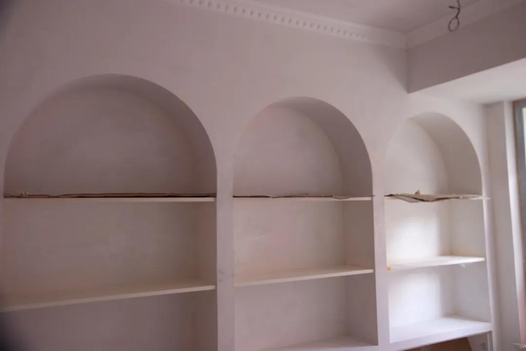 第三個(gè)工地正在硬裝進(jìn)行中。這套案例設(shè)計(jì)上的巧思和花樣比較多,類似浮雕的花紋已經(jīng)做好造型,等待燈具的安裝;衛(wèi)生間的墻面也完成了,如同馬賽克的六邊形花紋拼貼低調(diào)中透露出一絲藝術(shù)性,拱門般的柜架設(shè)計(jì)還帶來不少別樣風(fēng)情。相信在不久之后,這里會(huì)是客戶溫暖而美麗的家。