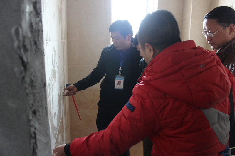 巡查小組在認真探討墻面貼磚工藝細節(jié)