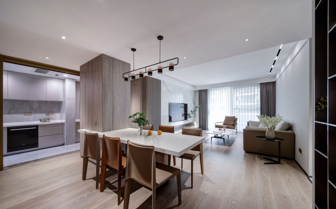 采用明亮而不眩目的無(wú)主燈設(shè)計(jì),筒燈與磁吸燈簡(jiǎn)約靈活的泛光照明電視背景墻下隱藏?zé)魩У男Ч麪I(yíng)造,優(yōu)化了空間形體以及局部的明暗關(guān)系。