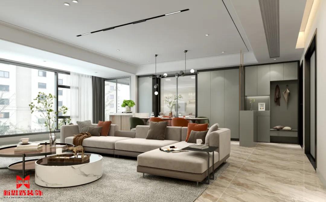 客廳采用無(wú)主燈設(shè)計(jì),線條磁吸燈造型流暢動(dòng)感又富有藝術(shù)氣息。接近落地的玻璃窗起到了極佳的采光作用,配合柔和的室內(nèi)光源與布藝沙發(fā),為空間增添不少溫馨感。