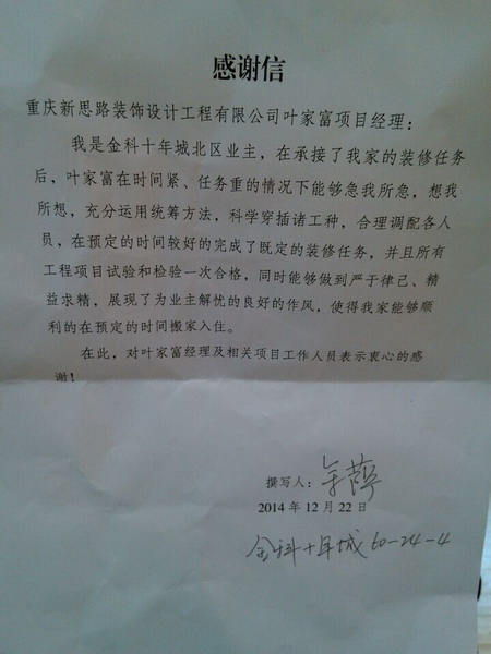 12月22日下午,新思路裝飾江北店收到了金科十年城業(yè)主余老師親自送來一封感謝信。信里洋溢著她對(duì)公司及葉家富工長(zhǎng)的贊美和感謝之情,也讓我們感受到了來自冬日里的一抹溫暖和感動(dòng)。