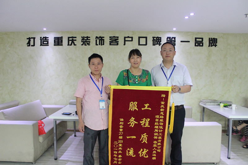 6月30日下午,來自保利香雪27幢的業(yè)主辜女士專程來到南坪總部,將一面寫著“工程質(zhì)優(yōu),服務(wù)一流”的錦旗親自交到工程部文經(jīng)理手中,以感謝新思路裝飾在為她愛家裝修過程中提供的高品質(zhì)裝修服務(wù)。