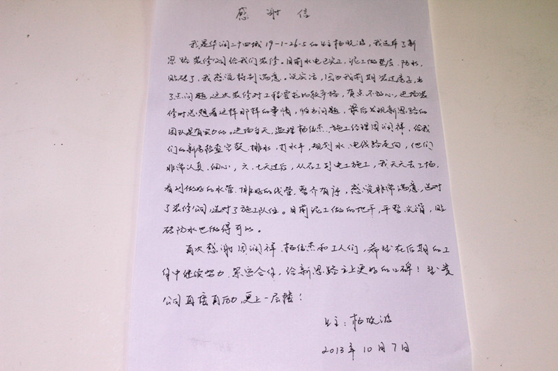 10月7日下午,華潤(rùn)二十四城19-1-26的業(yè)主楊老師親自來到新思路裝飾南坪總部,將一封滿含謝意的感謝信送到了工程部文經(jīng)理手中。