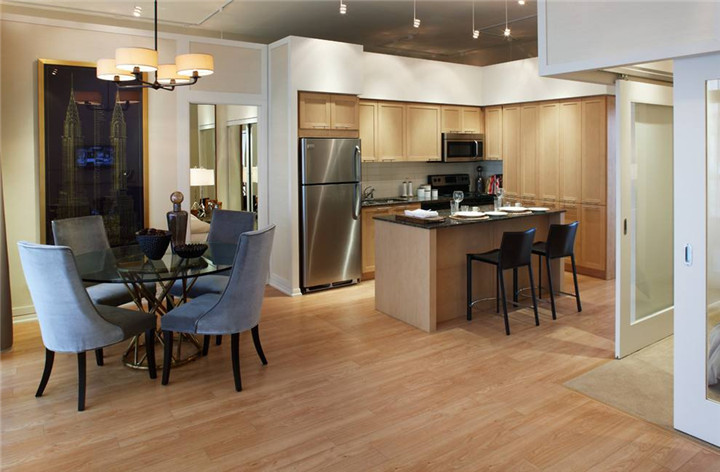 2:選用易潔材料。餐廳和客廳的墻面、地面應(yīng)與廚房一樣選用容易清潔的材料,地面最好選用地磚、強化地板等材料,切忌鋪貼實木地板,因為實木地板容易受熱氣影響產(chǎn)生變形,縫隙間也容易沾上油污。
